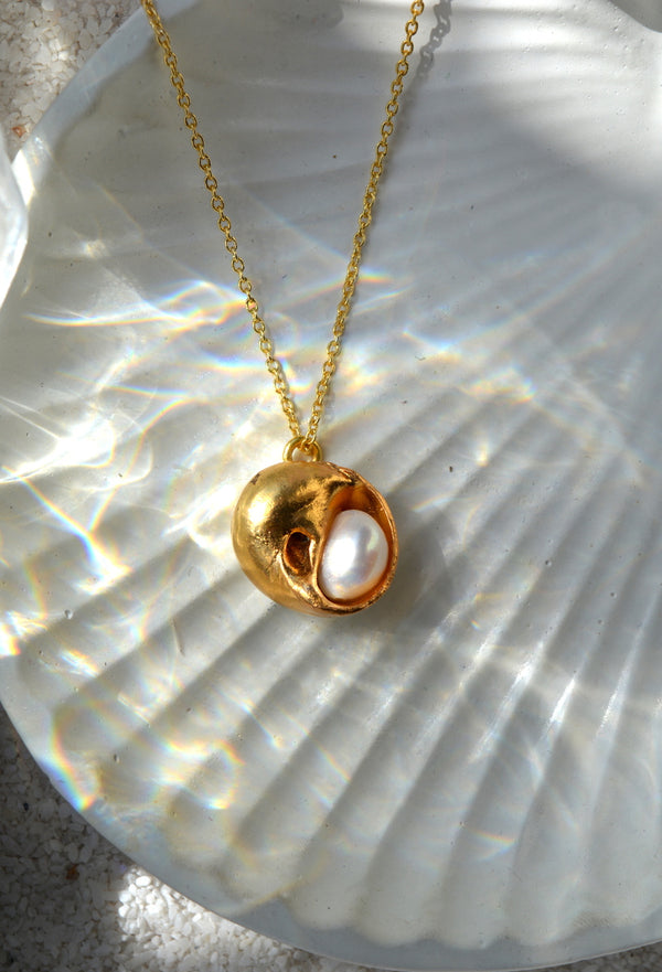 ✦ Opulence of shells plated in 22k gold with freshwater pearl