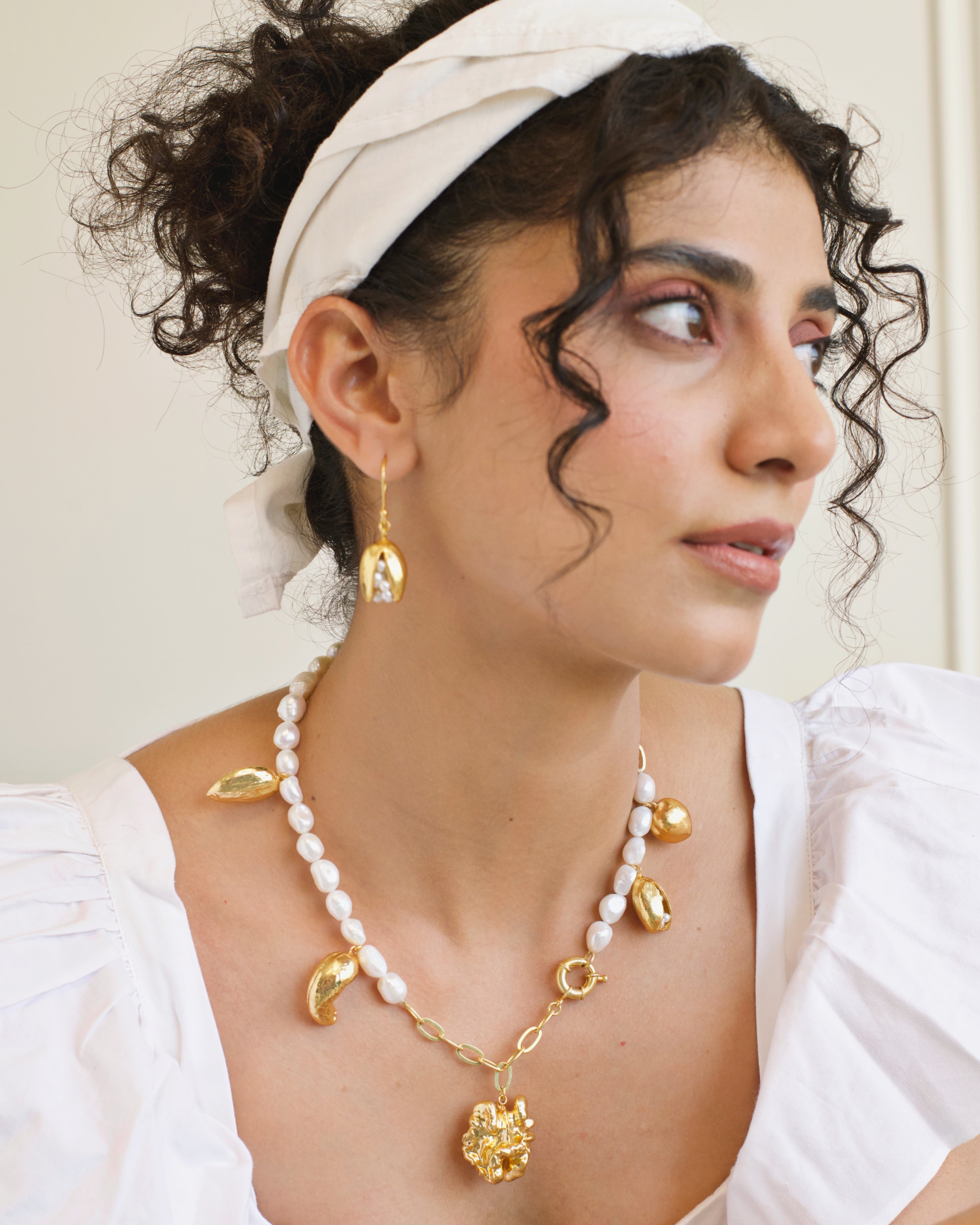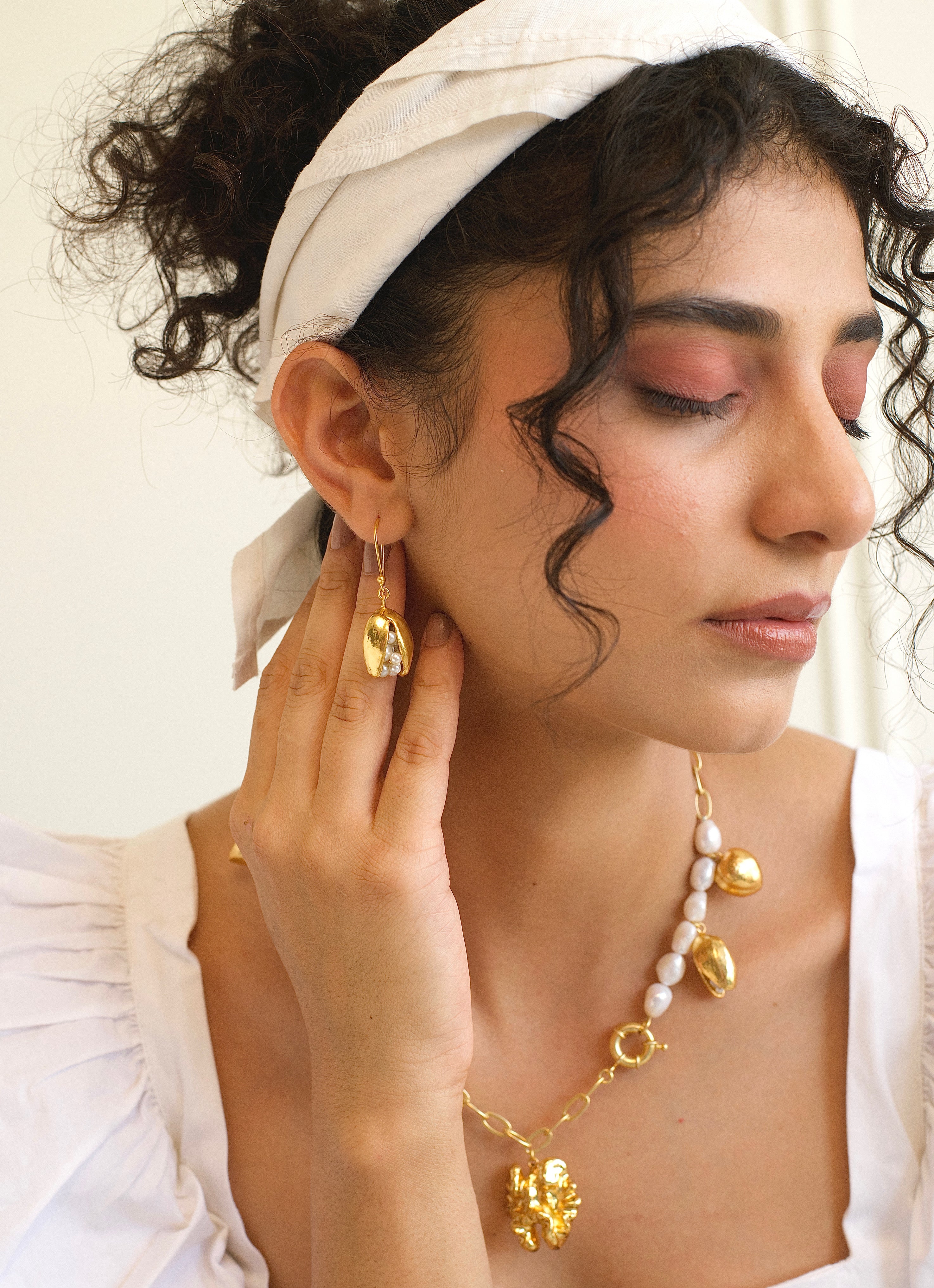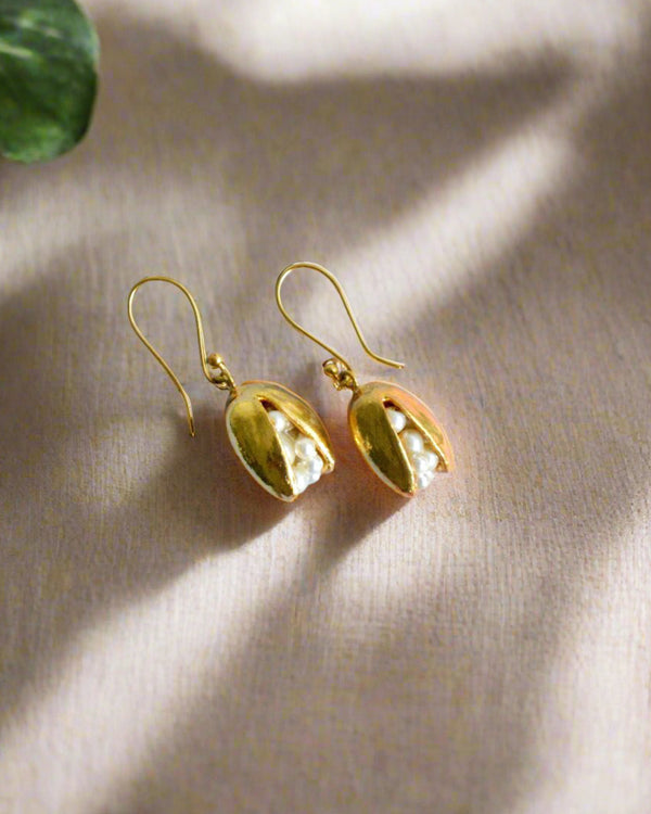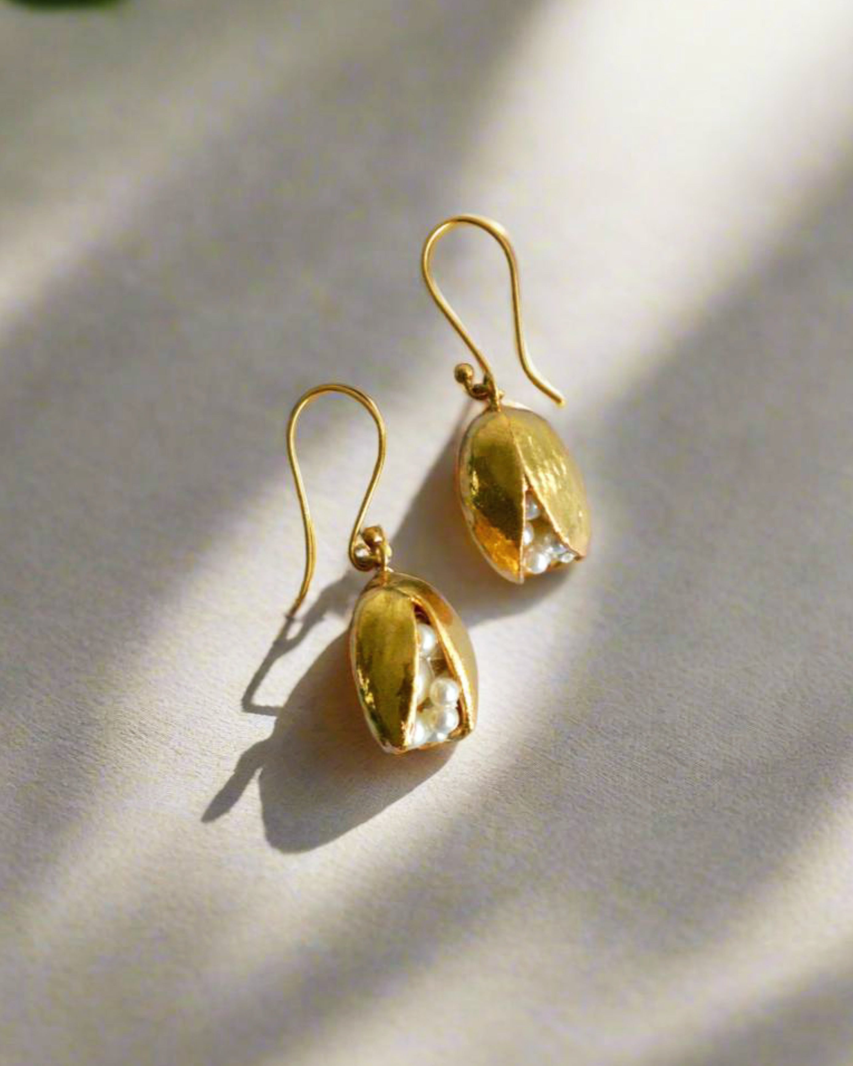 Whispering the secrets of the sea, these earrings cradle a cluster of luminous pearls within a gold-plated pistachio shell, like treasures hidden in nature’s embrace. They speak of beauty that lies quietly beneath the surface, the richness found in simplicity, and the poetry of organic form. With every wear, they invite you to honor the delicate wonders of the natural world, turning each moment into a celebration of elegance, mystery, and grace.